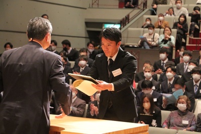 第2部表彰式は、浅見光男理事長の開式のことばで始まりました。国歌斉唱に続いて、岡部素明会長があいさつを行い、続いて来賓の飯能市長新井重治様、飯能市議会議長中元太様、埼玉県議会議員内沼博史様にお言葉をいただきました。
