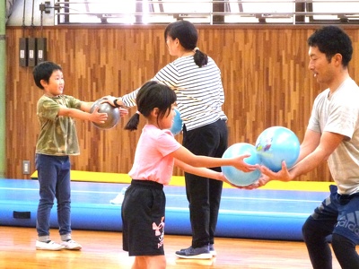 その後体育館に移り、「くの字」・「Sの字」を中心としたラディアンと呼ばれる基礎運動、さらにはボールを使った運動、フラフープを使った運動等、子どもたちを飽きさせない多彩なプログラムで参加した、子どもたちは実践する毎に適応能力ができ、親子共々楽しく体験することが出来ました。