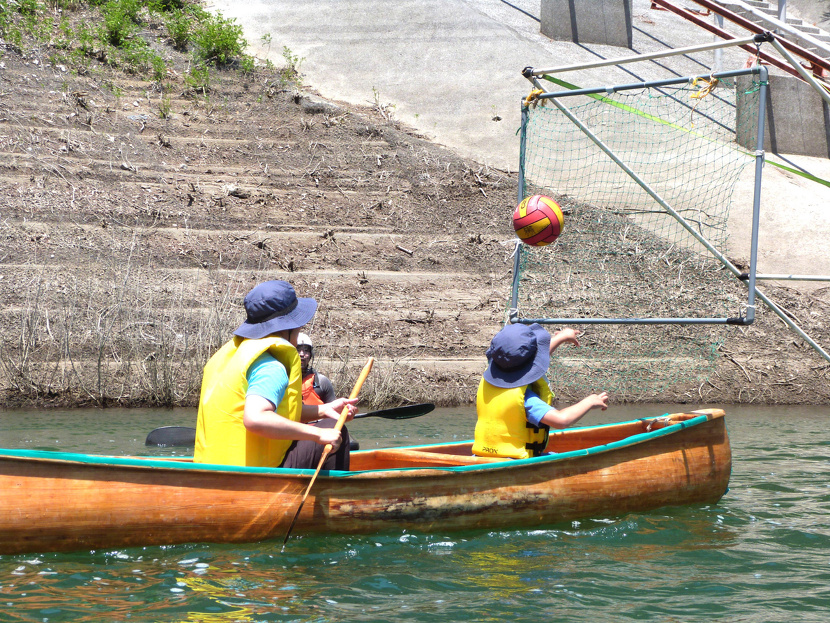 最後に、指導者の方たちが行うボールを使ってのカヌーポロ競技を見学し、お子さんたちも不安定なカヌーに腰を据えて、ゴールにボールを投げ込む競技の一部を体験していただき、親子カヌー体験教室は終了しました。