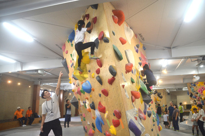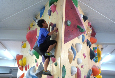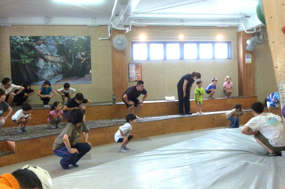 体験教室は開講式後、指導者の方たちから準備体操やルール、注意事項等を教えていただき、2チームに分かれてホールド(カラフルな突起物)を使っての挑戦が始まりました。