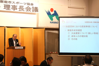 本年度、第一部報告会では、飯能市スポーツ協会関口正博副会長の開会のことば、岡部素明会長の挨拶、その後報告会が行われました。最初に、関口副会長の進行により、本年7月に実施しました加盟団体に対する懸案事項のアンケートを集計した内容の報告の中で、活動を活性化する方策を実施している3団体に事例紹介をお願いしました。事例紹介では、飯能市卓球連盟からは浅見光男理事長、飯能ホッケー連盟からは青田精一理事長、南高麗スポーツ協会からは小見山実会長より行われました。