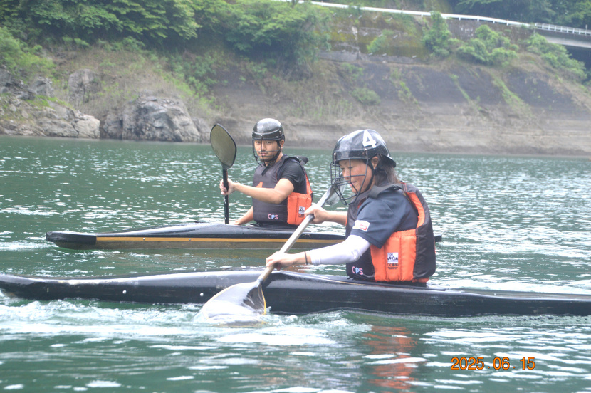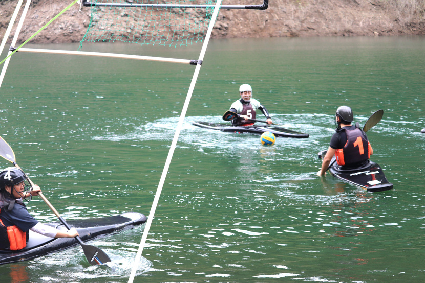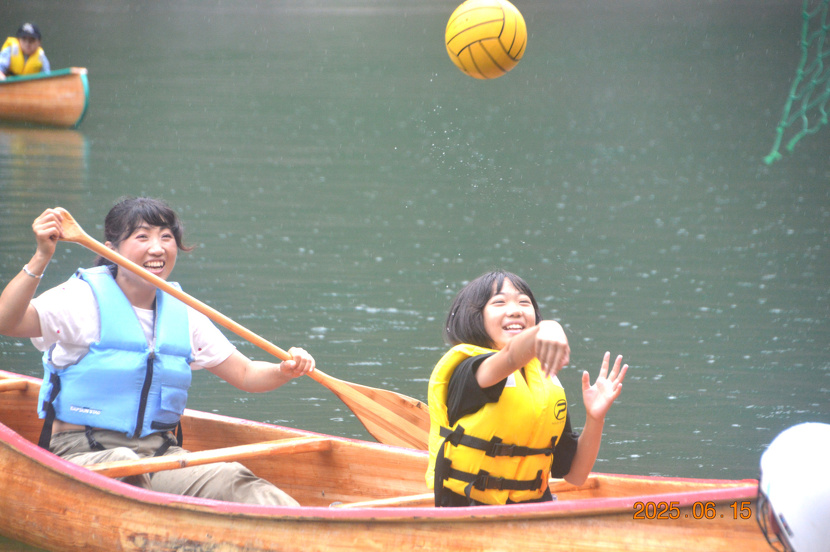最後に指導者が行うポロカヌー競技に挑戦。不安定に揺れるカヌーに座った状態でバランスを整えながらボールを投げ入れ、入るまで真剣にゴールを目指す姿、そしてシュートできると溢れる笑顔でした。参加者たちは、終了時間まで思いっきり楽しむ姿が多くみられました。