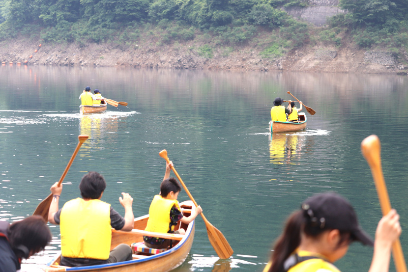 始めに指導していただく、駿河台大学カヌー部OBが中心に活動をしている「かわうそカヌーポロクラブ」の方々にライフジャケットの正しい装着方法、水での事故の回避方法、パドルの持ち方と前後の水のかき方等を教えていただき、一組ずつ慎重に湖に出ていきました。