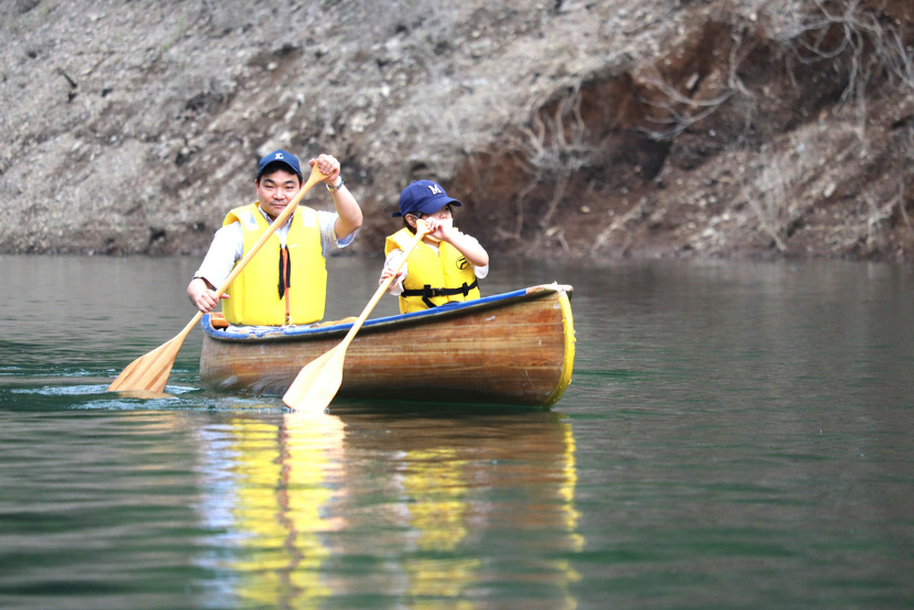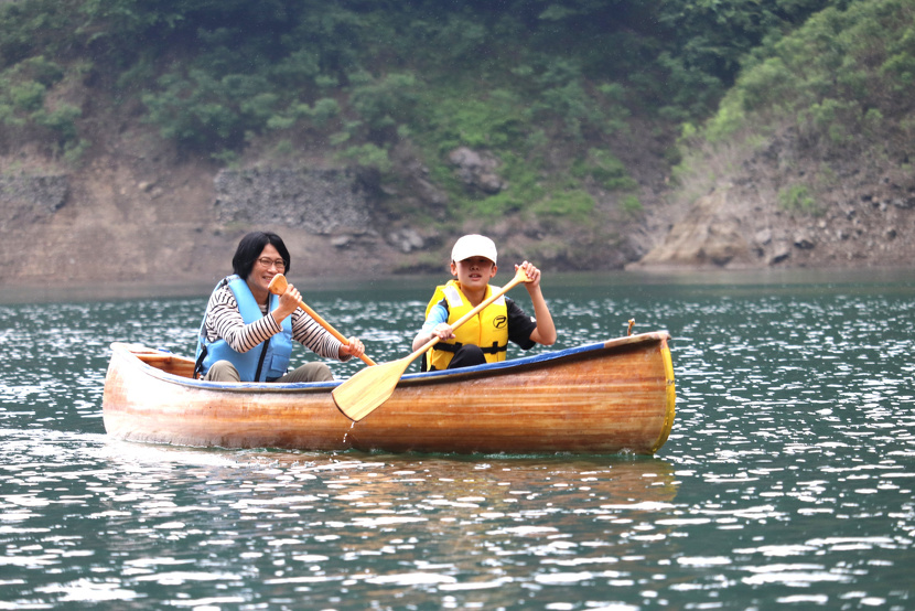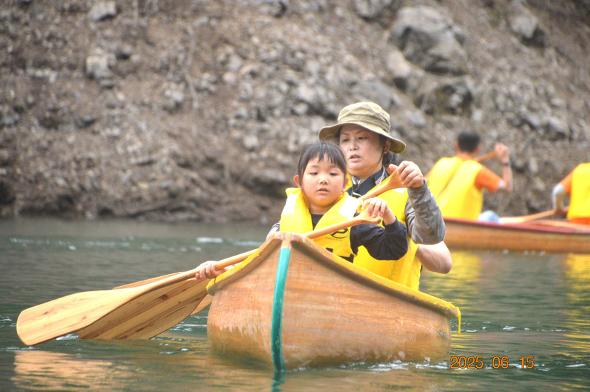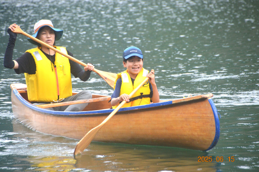 しばらくすると少しずつ慣れてきて、親子で歌を歌いながらリズムに合わせてパドルを漕ぎ進む様子も見られました。途中から湖面に雨粒が落ちてきましたが、“気持ちいい~・パパ見てますか~”と声援を送る父親に手を振ったり、“去年行けなかった所まで今年は行けた~”と皆さんの楽しむ様子が伝わってきました。