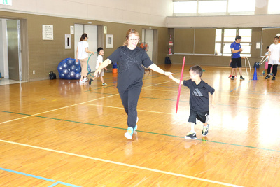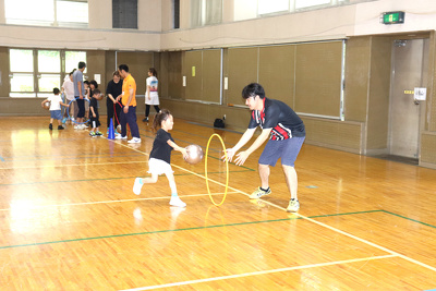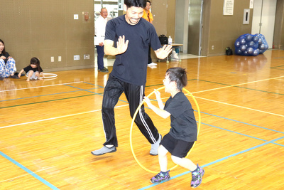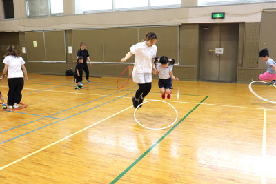 次の体験では、親子で向き合って同じ動作をしたり、フラフープやボールを使った受け渡し、手をつないで″鬼ごっこ″などの遊びを通し、自然に身体を動かす楽しさが拡がっていきました。